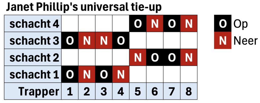 Na wat zoeken en bladeren las ik over een ‘universele aanbinding’ (Universal tie-up) voor getouwen met vier schachten en acht trappers. Dat zit zo: Een schacht kan in een hoge positie staan (op) of in een lage (neer). Een getouw met vier schachten heeft in principe dus zestien (4×4) verschillende schacht-combinaties. Het principe van de universele aanbinding is even simpel als doeltreffend. Met de pedalen een tot en met vier ‘betrap je’ de schachten een en drie. Iedere trapper geeft een van de vier mogelijke combinaties: Beiden op, beiden neer, een op en drie neer, drie neer en een op. Met de trappers vijf tot en met acht geven dezelfde combinaties voor schachten twee en vier. Door nu met de linker voet een van de eerste vier trappers te kiezen, en tegelijkertijd met de rechtervoet een van de vier laatste trappers, kun je in totaal alle zestien verschillende schachtcombinaties trappen.
