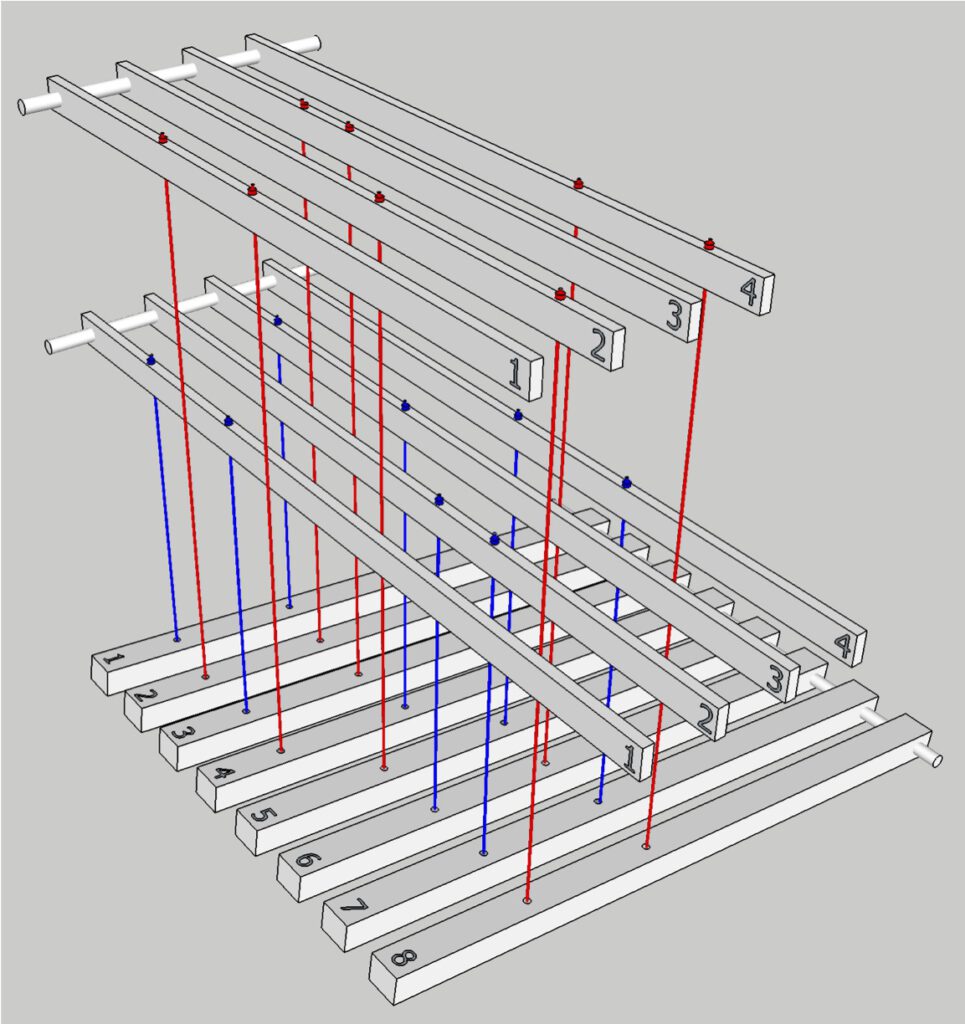 Op een contramars getouw ziet de aanbinding er dan als volgt uit. De rode draden zijn de aanbinding voor de bovenste schemels (die zoals gebruikelijk zijn verbonden met de onderste schacht latten) en de blauwe draden zijn verbonden met de onderste lange schemels (die verbonden zijn met de wippers). Als je het eenmaal door hebt is het lekker overzichtelijk met twee draden per trapper in plaats van de gebruikelijke vier draden bij een patroonaanbinding.