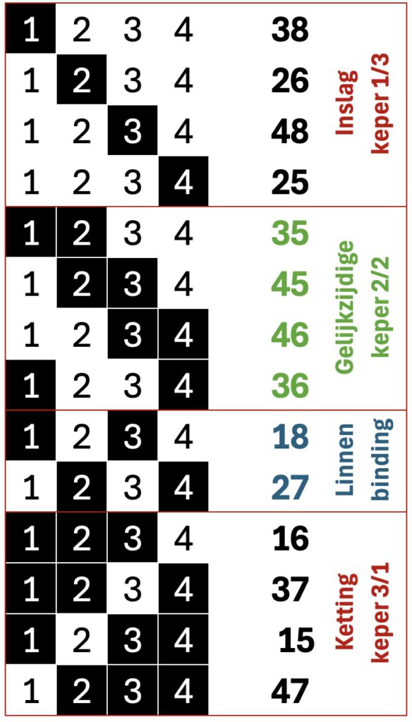 Voor het gemak heb ik de namen van enkele (hoofd)bindingen in het schema geplaatst. Nu is de binding natuurlijk afhankelijk van de inrijging die je hebt gekozen. De bindingen die ik hier heb genoemd ontstaan bij een basis ‘strait draft‘ inrijging (van rechtsboven naar linksonder). Wil je bijvoorbeeld een linnenbinding weven, dan trap je 18-27-18-27 enzovoort. Wil je vervolgens overgaan naar een gelijkzijdige keper, dan wissel je van trappers en volgt 35-45-46-36 en weer van voor af aan.
