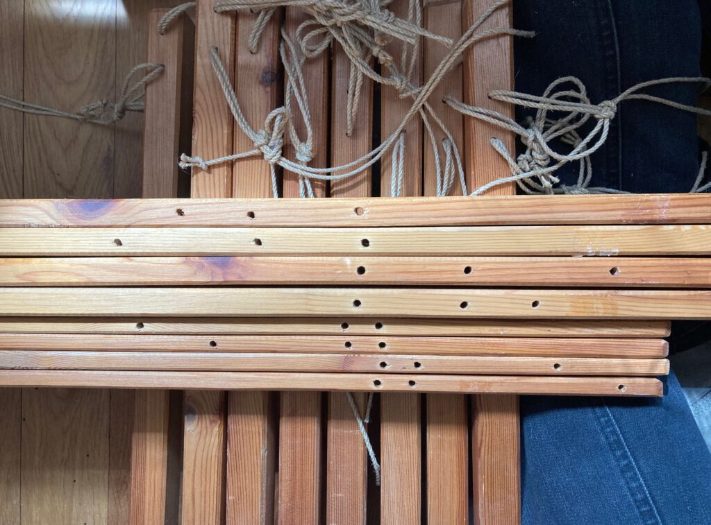 Nu ben ik gewend om mijn getouwen per project opnieuw aan te binden, al naar gelang het patroon wat ik heb gekozen en de gewenste trapvolgorde die ik ga aanhouden. Daarvoor heeft iedere schemel minimaal even veel aanbind gaten als dat er trappers zijn, en heeft iedere trapper minimaal even veel aanbind gaten als dat het getouw schachten (en dus schemels) heeft.
