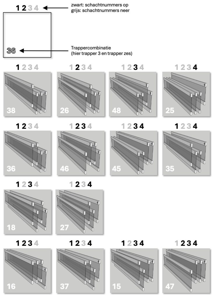 Het bijgaand schema geeft met welke trappers je een bepaalde schachten combinatie opzet. Wil je bijvoorbeeld alleen schacht eeen op hebben, en de rest neer, dan trap je trapper drie en acht tegelijk in (’38’ dus). Wil je schacht twee en vier op hebben en de rest neer, dan trap je trapper twee en zeven in (’27’ dus).
